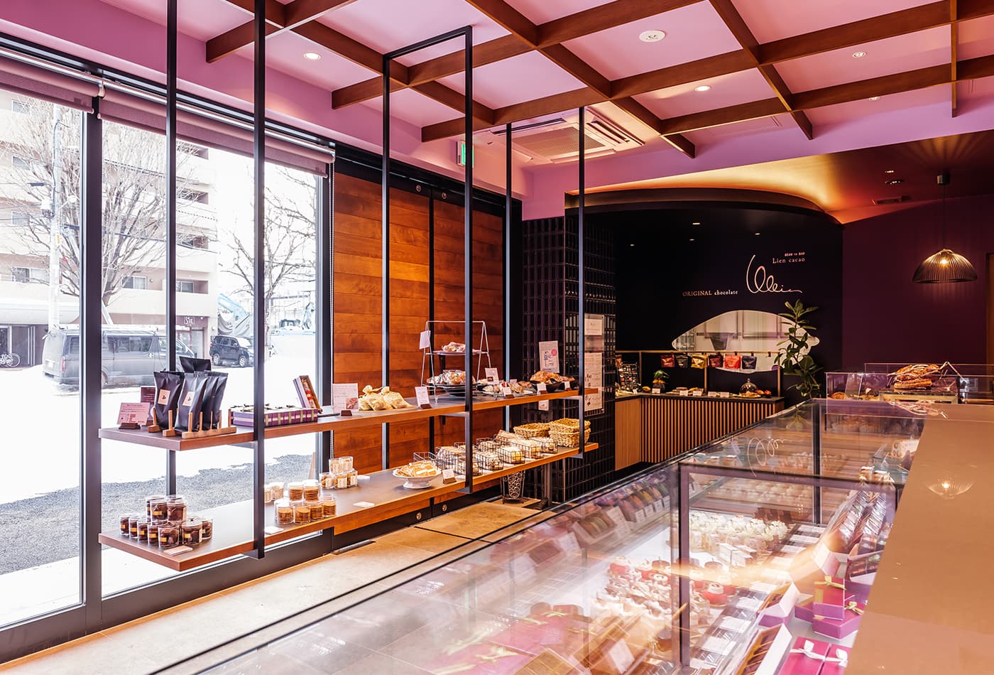 大きなガラス戸から太陽光が差し込む店内は、パープルと木目を基調とした